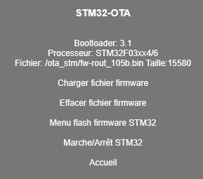 Cliquer sur "Menu flash firmware STM32", puis cliquer sur "efface STM32" attendre la confirmation "effacement réussi" puis cliquer sur "retour" et cliquer sur "Flash STM32", attendre la confirmation "60-220 ........ Terminé ! Redémarrage du routeur... etc"